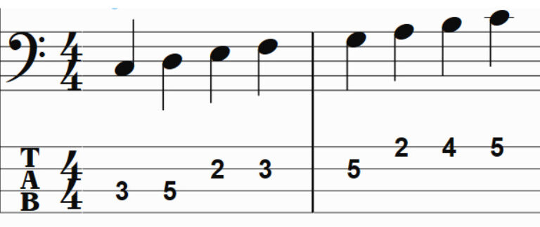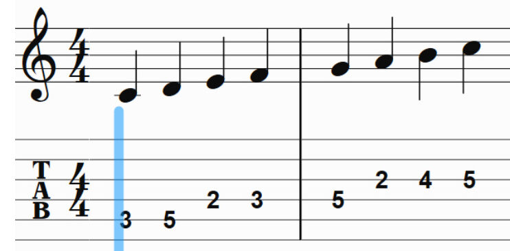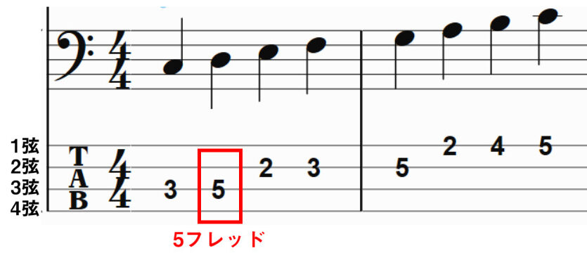ギターのTAB譜同様に、TABの1番下の線は4弦、つまり楽器を構えたときに1番自分側に来る弦で、