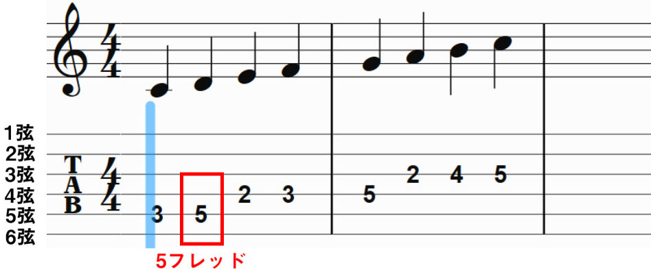 この赤枠で囲っている部分は下から2本目の線ですので、3弦。数字が5なので5フレット目。