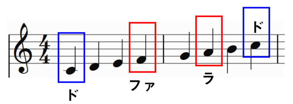 オレンジ色のドの部分はスネアドラム、黄色のソ部分はハイハット、青色のラ部分はシンバルです。