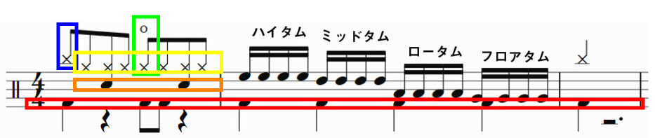 このタムの部分に関しては、基本的にタムの何個が何個であっても、五線譜の高い位置にある方が、実際のドラムセットの中で1番高い音が鳴るタムだと覚えればすぐに覚えることができます。